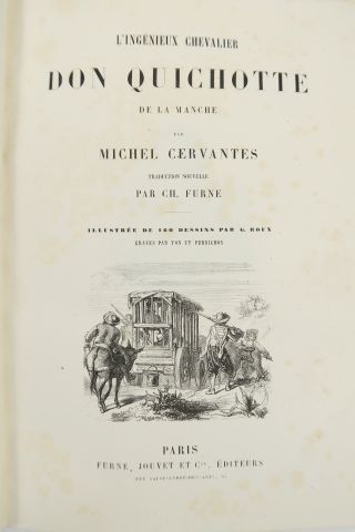 CERVANTÈS (Michel). L'ingénieux Don Quichotte de la Manche. Trad. nouvelle par Ch. Furne. Illustrée de 160 dessins par G. ROUX. Paris, Furne et Jouvet s.d. gd in-8. 1/2 maroquin havane, caissons à froid, tête dor., couv. et dos cons. (Rel. postérieure). Figures gravées sur bois, texte en 2 colonnes. Bel exemplaire frais, finement relié.