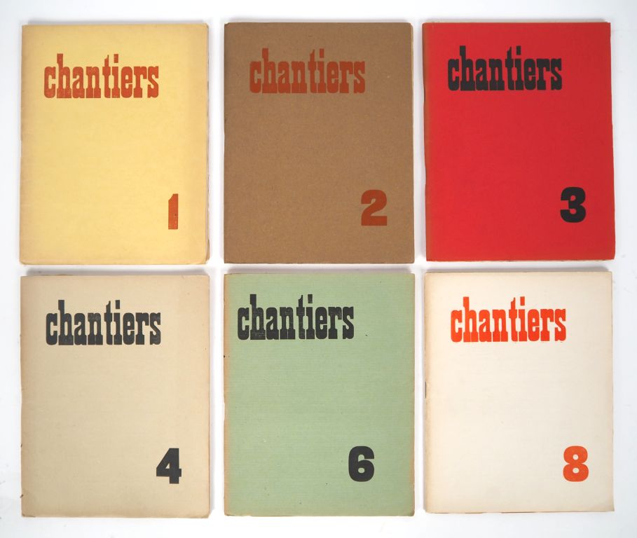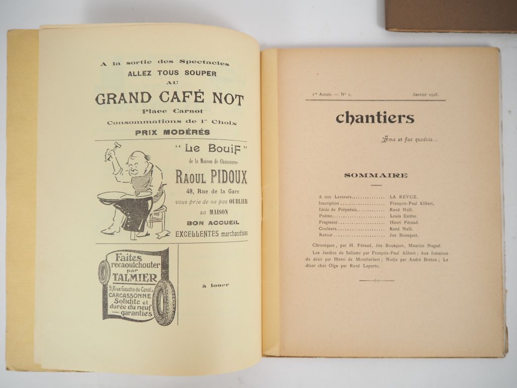 CHANTIERS. Numéros 1-2-3-4-6-8. Carcassonne, Chantiers, 1928-1930. Six plaquettes agrafées. ÉDITION ORIGINALE de cette revue née à Carcassonne dans la chambre de Joë Bousquet sous l’étoile surréaliste et qui comptera 9 numéros parus de 1928 à 1930, « imprimés à Carcassonne et en vente partout ». François-Paul Alibert, Joë Bousquet, Claude Estève, René Nelli, Ferdinand Alquié, Maurice Nogué et Henri Féraud sont les premiers collaborateurs de la revue , viennent s’y adjoindre, enthousiasmés par l’aventure, les poètes Paul Éluard, André Gaillard, Benjamin Fondane, André de Richaud, Michel Leiris et les peintres Max Ernst et George Malkine. L’intégralité des numéros de la revue est difficile à réunir. Robert Capdeville, dans la réédition en 1987 de la revue par J.-M. Place, écrivait en effet : « Aucune grande collection publique – ni la Bibliothèque Nationale, ni la Bibliothèque Jacques Doucet – ne possède la série des neuf numéros de Chantiers ». BEL ENSEMBLE, malgré le manque des numéros 5, 7 et 9.