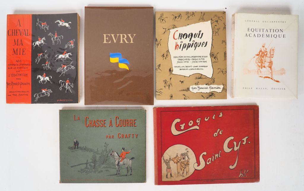 [CHASSE - CHEVAL]. CRAFTY. La Chasse à courre. (1888). In-4 à l’italienne percaline décorée de l’éditeur (corps d’ouvrage dérelié) – [VAUFRELAND (H. de)]. Croquis de Saint Cyr. [c. 1900]. In-4 à l’italienne cartonnage papier décoré de l’éditeur – BENOIST-GIRONIÈRE (Y.). Croquis hippiques. (1953). Grand in-4 broché. E.A.S. – DECARPENTRY (Général). Équitation académique. (1964). In-4 broché – BENOIST-GIRONIÈRE (Y.). À cheval ma mie. (1961). Grand in-4 broché – RIANT (F.). De la vallée de la Solle à Évry. (1973). Grand in-8 toilé. ENSEMBLE DE 6 OUVRAGES.