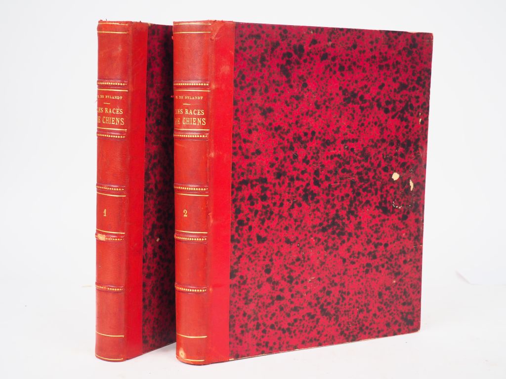 [CHASSE - CHIEN]. BYLANDT (Comte H. de). LES RACES DE CHIEN. Bruxelles, Vanbuggenhoudt, 1897. Ouvrage en 3 parties reliées en 2 volumes grand in-4 ½ basane rouge, dos à nerfs filetés or, titre doré (Reliure de l’époque). Petits manques de papier sur les plats, petites épidermures et frottements aux reliures. ÉDITION ORIGINALE de cet IMPORTANT OUVRAGE (1160 pages) « traitant de 316 races et sous-variétés, avec 1392 gravures représentant 2064 chiens ». Important index in fine. ¶ Thiebaud, 142.