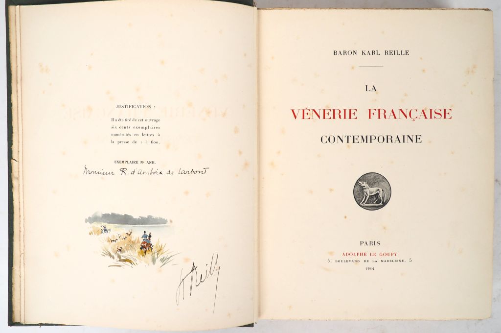 [CHASSE]. REILLE (Baron Karl). LA VÉNERIE FRANÇAISE CONTEMPORAINE. P., Le Goupy, 1914. Grand in-4 toile verte de l’éditeur, plat supérieur orné d’un massacre de cerf et pastille dorée illustrée, dos lisse, titre doré. Rousseurs claires. ÉDITION ORIGINALE. Illustrations en couleurs et en bistre. Tirage limité à 600 EXEMPLAIRES numérotés sur vélin. Exemplaire nominatif n°AHN de Monsieur R. d’Amboix de Larbont. Exemplaire enrichi d’une AQUARELLE ORIGINALE signée K. Reille à la justification. ¶ Thiébaud, 772 : « Ce beau volume est extrêmement recherché aujourd’hui et devient de plus en plus rare. »