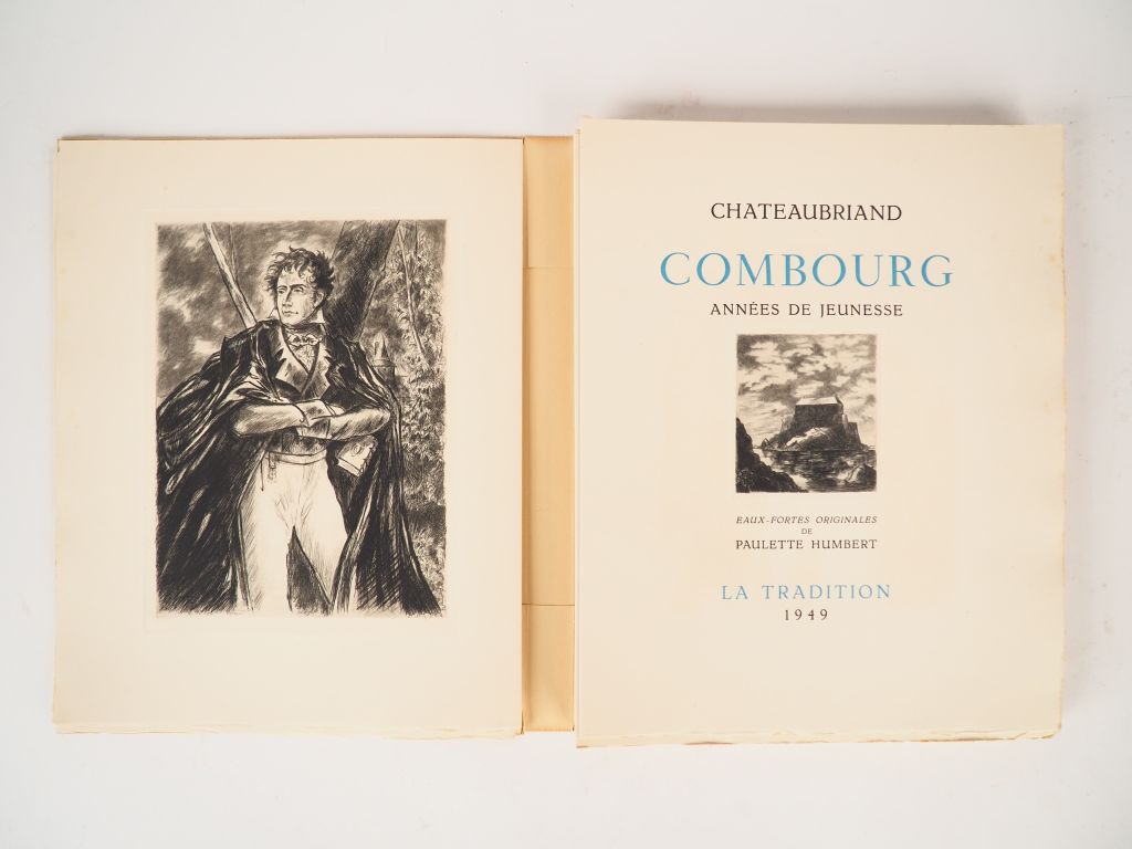 CHATEAUBRIAND. Combourg. Années de jeunesse. Eaux-fortes originales de Paulette HUMBERT. Paris, La Tradition 1949 in-4 en ff. chemise et étui. 22 eaux-fortes en noir dans le texte et hors-texte. Tirage unique à 485 ex. sur vélin de Cana, celui-ci signé par l'artiste