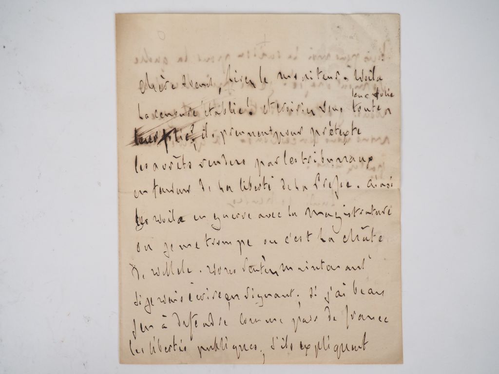 CHATEAUBRIAND (Fr.-René de). LETTRE AUTOGRAPHE adressée à sa « chère sœur », la duchesse de Duras. Lundi 10 heures [c. 12 mars 1827]. 1 p. ½ in-4. LETTRE relative à la liberté de la presse : « Voilà la censure établie ! ». La duchesse de DURAS (1777-1828), auteur du fameux roman Ourika dans lequel elle analyse les questions d’égalité raciale et sexuelle, est considérée aujourd’hui comme une des premières féministes. Elle fut l’une des correspondantes les plus fidèles de Chateaubriand et une amie dévouée qui favorisa sa carrière politique et diplomatique.