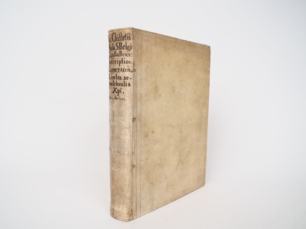 CHIFFLET (Jean). Aula sacra principium belgii… - Sacris Inscriptionibus, quibus tabella D. Virginis illustrator… - De Linteis sepulchralibus Christi servatori… - Vetus imago sanctissimae deiparae, in jaspide viridi, operis anaglyphi, inscripta nicephoro botaniatae.. - Annalus Pontificius Pio papae II… Anvers, Ex Off - Plantiniara, B. Moreti 1650 - 1649 - 1638. Vélin ivoire à recouvrement (Rel. d'époque). Regroupement de 5 études érudites de Jean Chiffet, Chanoine de Tournais, et aumonier de l'Infante des Pays-Bas espagnoles. Une planche dépliante sur le suaire du Christ et quelques figures en taille-douce.