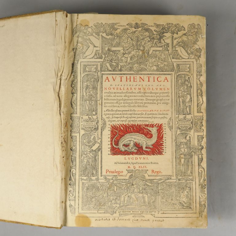 [CODE JUSTINIEN]. Authentica Novellarum Volumen eruditis animadversionibus… Adjectus est nune primum libellus Novellarum D. Just é graeca epitome, in latinum compendium versus… Lyon, Les Frères Senneton, A l'enseigne de la Salamandre. 1549 (7 ff.). -448-288-160 col. (4ff.). 74 col. (1f.) - D. Just. Imp. Institutiones emendatae, aum reliqua juris Diexodo, ad optimi cujusque archetypi anagnosim, ex ant. Italiae et Gelliarum bibliothecius. Lyon, Les Frères Senneton. A l'enseigne de la Salamandre 1549. (16 ff.). 478. 54 col. Ensemble de 2 ouvrages en 1 vol. in-folio. Reliure d'époque peau retournée ornée de fil. à froid (manque de peau aux coiffes). Belle impression lyonnaise en rouge et noir. Deux très beaux titres ornés d'un portique historié, avec la vignette à la Salamandre de l'imprimeur coloriée en rouge. Deux beaux diagrammes "Arbor feudorum" et "Arbor Civilis" en pleine page, nombreuses figures, imblèmes et lettrines historiées, le tout gravé sur bois. Cernes de mouillure à quelque page, un trou avec perte de qqs lettres aux deux derniers ff. du premier ouvrage