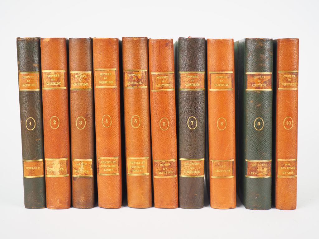 COURTELINE (George). Œuvres complètes. Illustrations de Dunoyer de Segonzac, Jean-Louis Forain, Pierre Devaux, Dignimont… Pari, Librairie de France 1930-1931. 10 vol. In-4. Reliure demi-chagrin vert à coins, couv. cons, têtes dor. (dos passés). Ex. num. sur pur fil de Lorraine