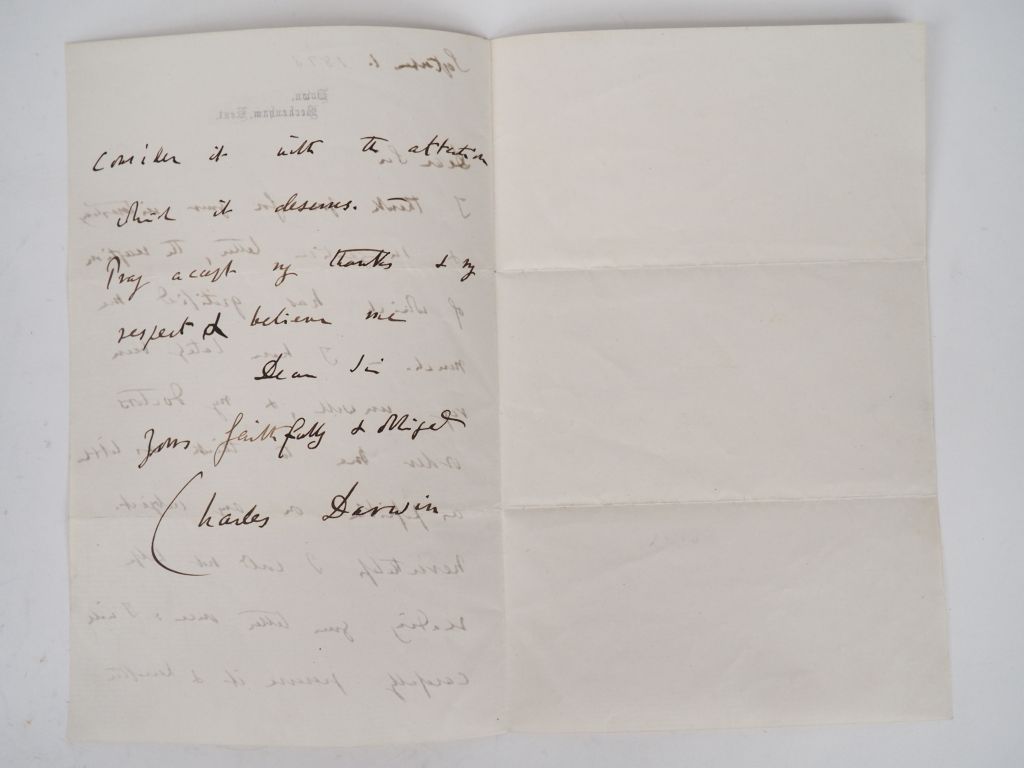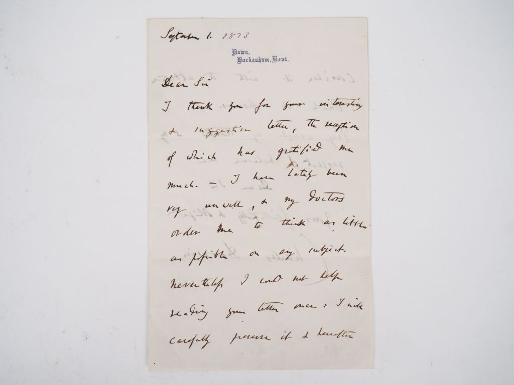 DARWIN (Charles). LETTRE AUTOGRAPHE SIGNÉE adressée au philosophe autrichien Theodor Gomperz. 1er septembre [1873]. 2 pp. in-8. IMPORTANT ET RARE DOCUMENT de la main du naturaliste et paléontologue britannique, en réponse à une « interesting suggestive letter » du philosophe autrichien. Malgré les recommandations des médecins qui lui recommandent de se reposer, Darwin ne peut s’empêcher de relire la lettre de son correspondant : « I will carefully preserve it hereafter consider it with the attention which it deserves. »