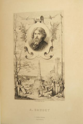 DAUDET (Alphonse). Aventures prodigieuses de Tartarin de Tarascon. Paris, Dentu 1872. in-12. 1/2 maroquin vert à coins, dos lisse orné de fleur., d'un cadre de fil. dor., de pt fleur. dor. et fleur. à froid (Rel. d'époque). Portrait gravé en frontispice. Edition originale. Bel exemplaire.