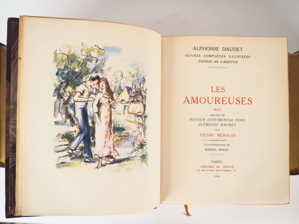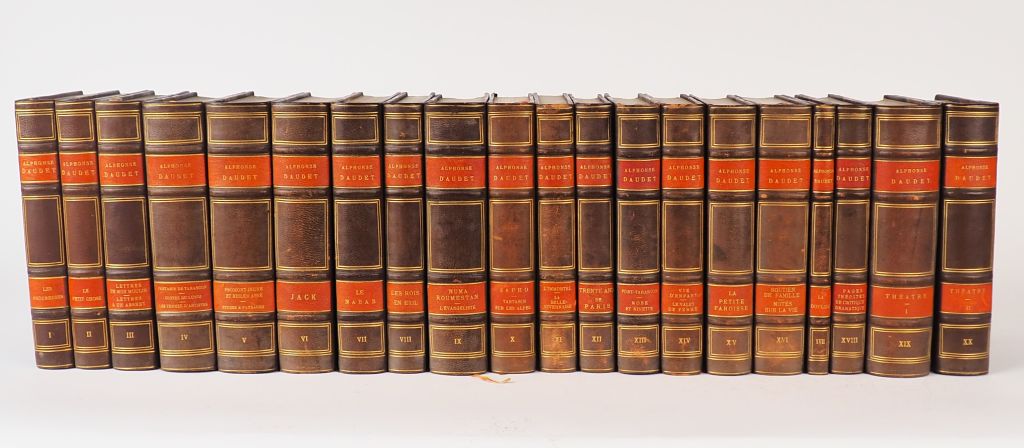 DAUDET (Alphonse). Œuvres complètes illustrées. Edition ne varietur. Paris, Librairie de France 1929-1930. 20 vol, in-4. Rel. demi-chagrin brun à coins, caissons dor. pces de titre rouge, tête dor. couv. et dos Illustrations de Edy Legrand, Picard Le Doux, Dignimont, Berthold Mann