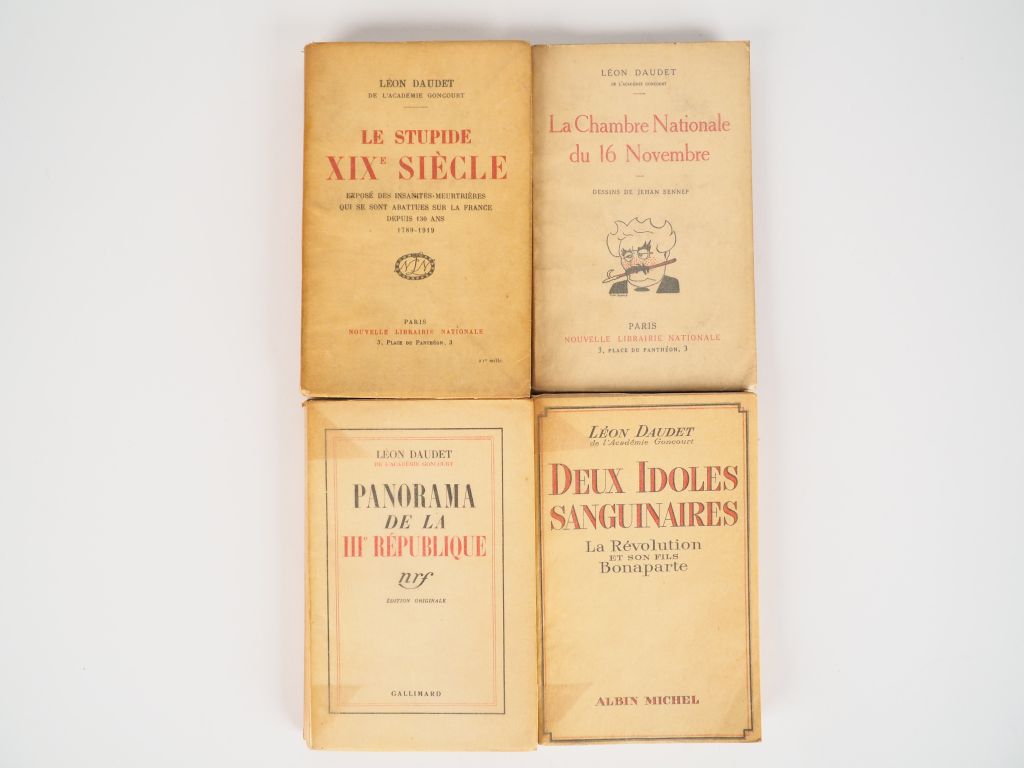 DAUDET (Léon). Le stupide XIXème siècle. Exposé des insanités meurtrières qu se sont abattues sur la France depuis 130 ans. 1789-1919. Paris, Nouvelle Librairie Nationale 1922. in-12, Ed. originale sur papier courant. Envoi a.s. - La Chambre Nationale du 16 Novembre. Portraits et tendances. Dessins de Jehan Sennep. Paris, Nouvelle Librairie Nationale 1923. in-12, br. Papier d'édition. - Deux idoles sanguinaires. La révolution et son fils Bonaparte. Paris, Albin Michel 1939. Ed. originale. Ex. sur alfa mousse. - Panorama de la IIIème République. Paris, Gallimard 1936. in-12, br. Ed. originale. Alfa navarre num. Ensemble de 4 volumes
