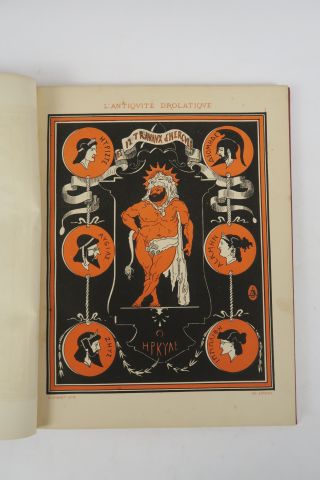 DOUZE TRAVAUX D'HERCULE (Les), illustrés par A. COINCHON, lithographiés par Henri SEVENET. Paris, Becquet s.d. (ca 1870). in-4. Percaline rouge, titre doré (Rel. éditeur). L'Antiquité drôlatique en 59 planches lithographiées en 2 couleurs (noir et orange).