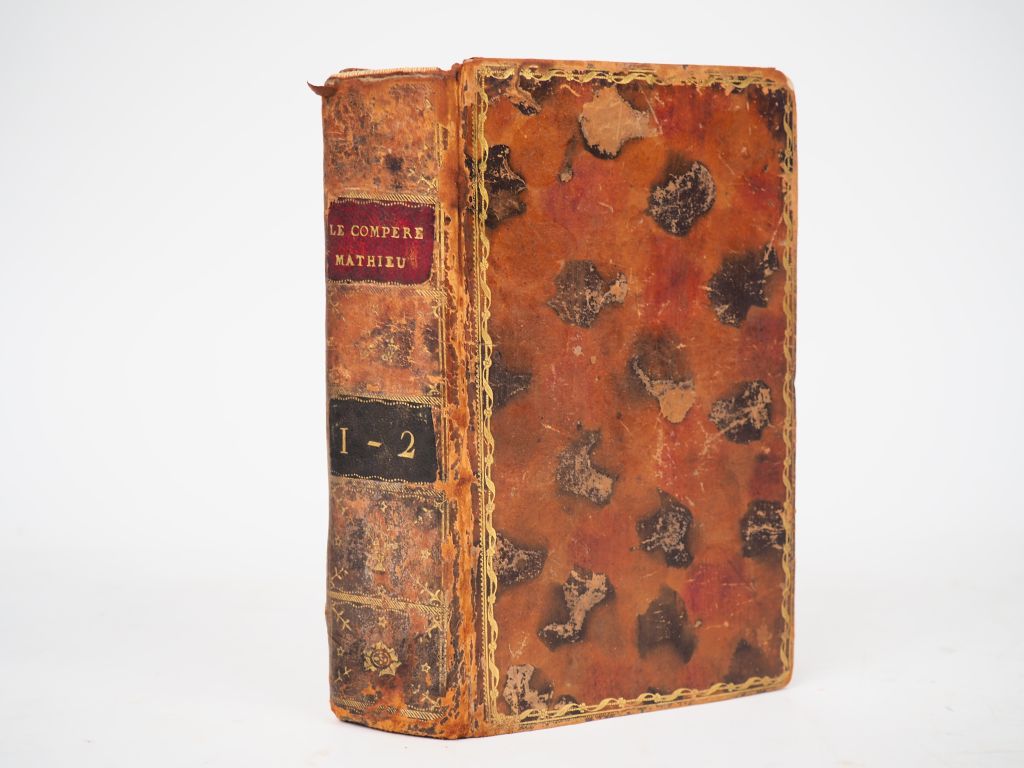 DU LAURENS. LE COMPÈRE MATHIEU, ou LES BIGARRURES DE L’ESPRIT HUMAIN. Londres, Aux Dépens de la Compagnie, 1772. Trois parties reliées en un fort volume in-12 veau porphyre, dos lisse cloisonné et orné, pièces de titre et de tomaison maroquin rouge et vert lierre, tranches dorées (Reliure de l'époque). Dos frotté, coiffe supérieure arasée. NOUVELLE ÉDITION de ce roman philosophique licencieux. ¶ Jammes, Bucher bibliographique, 425 pour l’édition de 1776 – Gay, I-637.
