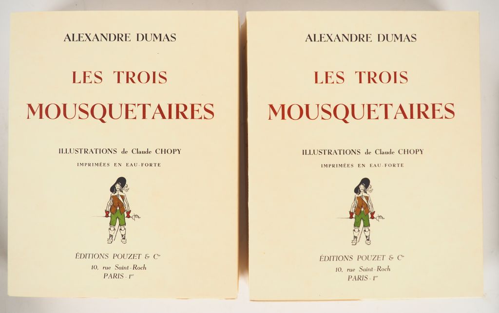 DUMAS (Alexandre). Les Trois Mousquetaires. Illustrations de Claude CHOPY, imprimées en eaux-forte en couleurs. Paris, Editions Pouzet 1946. 2 vol. in-4, brochés. Chemises et étui. Tirage : 773 ex. 1/620 vélin sur Rives