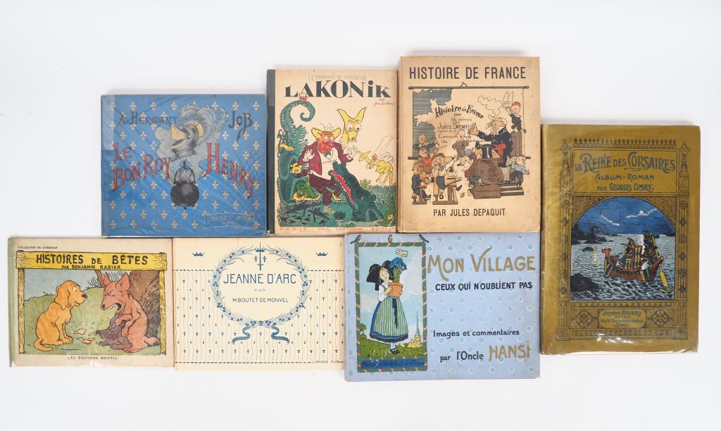 [ENFANTINA]. HERMANT (A.). LE BON ROY HENRY – BOUTET DE MONVEL. JEANNE D’ARC – BRÜLLER (J.). LE MARIAGE DE MONSIEUR LAKONIK – RABIER (B.). HISTOIRES DE BÊTES – HANSI. MON VILLAGE – DEPAQUIT (J.). HISTOIRE DE FRANCE – OMRY (G.). LA REINE DES CORSAIRES. ENSEMBLE DE 7 OUVRAGES.