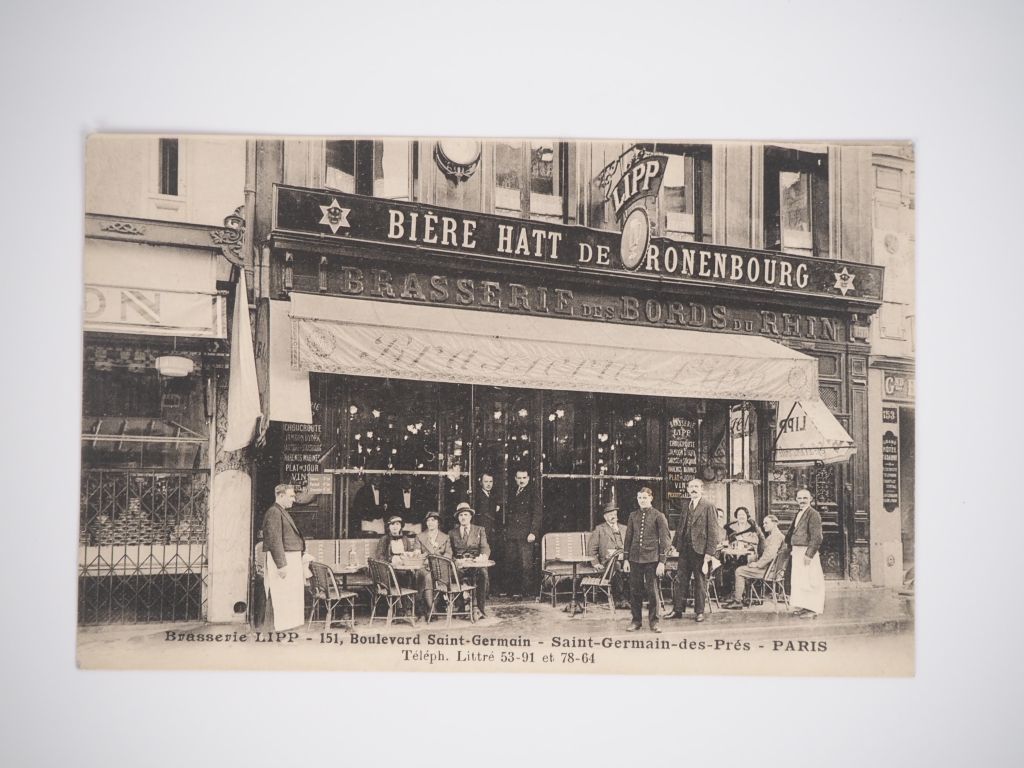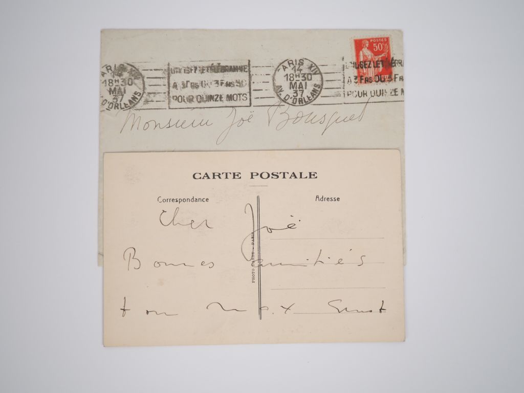 ERNST (M.). CARTE POSTALE signée adressée à Joë Bousquet. La carte représente la Brasserie Lipp à Saint-Germain-des-Prés. Elle contient au verso le texte autographe suivant : « Cher Joë / Bonnes amitiés / ton Max Ernst ». Joint l’enveloppe timbrée avec cachet encré daté « 14 mai [19]37 » et au verso l’adresse autographe de « Max Ernst. 26 rue des Plantes / Paris XIV ».