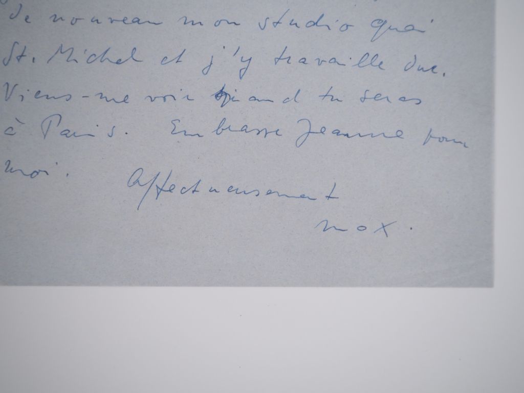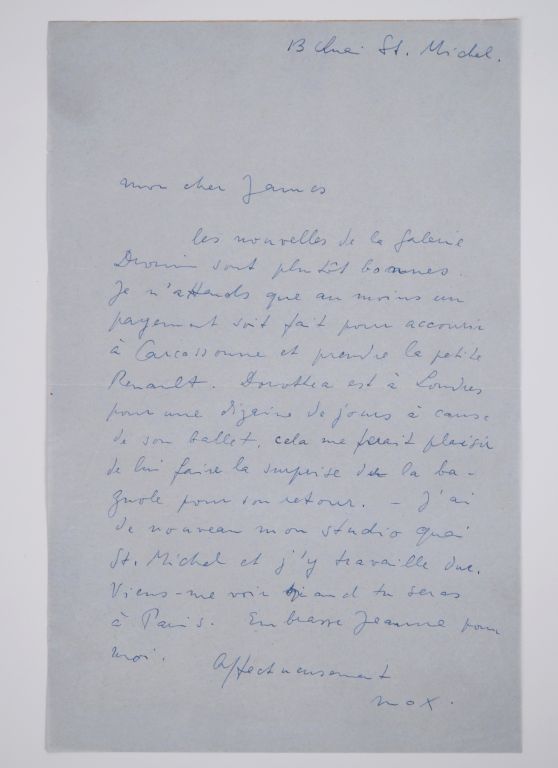 ERNST (M.). LETTRE AUTOGRAPHE signée adressée à James Ducellier. Une page sur un feuillet bleu ciel (208 X 134 mm) à en-tête manuscrit « 13 Quai St. Michel [1950] ». LETTRE DANS LAQUELLE MAX ERNST DONNE DES NOUVELLES À SON AMI. « Mon cher James, les nouvelles de la Galerie Drouin sont plutôt bonnes. Je n’attends que au moins un payement [sic] soit fait pour accourir à Carcassonne et prendre la petite Renault. Dorothea [Tanning] est à Londres pour une dizaine de jours à cause de son ballet. Cela me ferait plaisir de lui faire la surprise de la bagnole pour son retour. – J’ai de nouveau mon studio quai St. Michel et j’y travaille dur. Viens me voir quand tu seras à Paris. Embrasse Jeanne pour moi. Affectueusement, Max ».