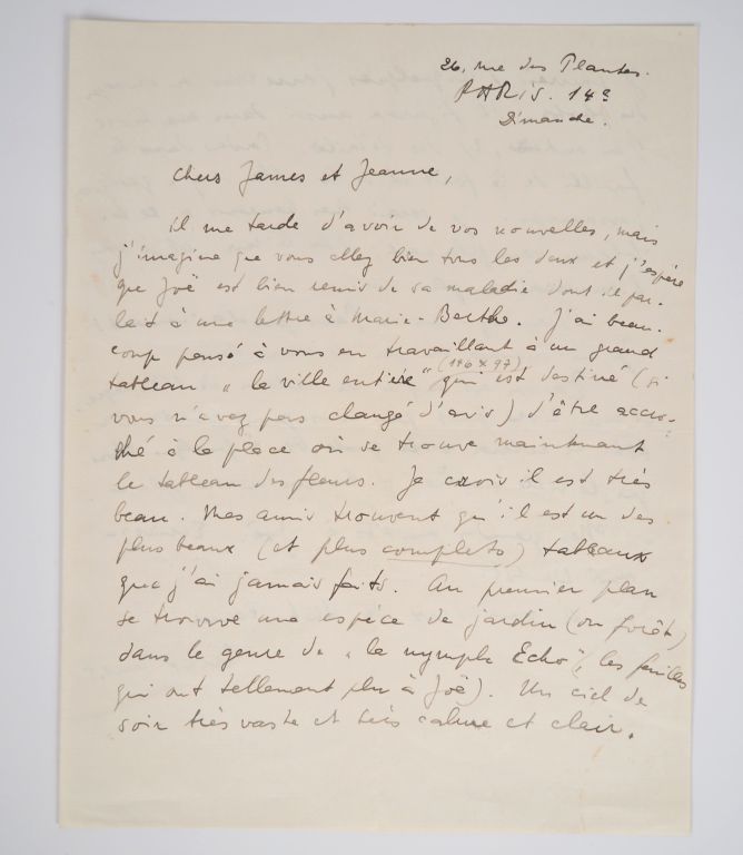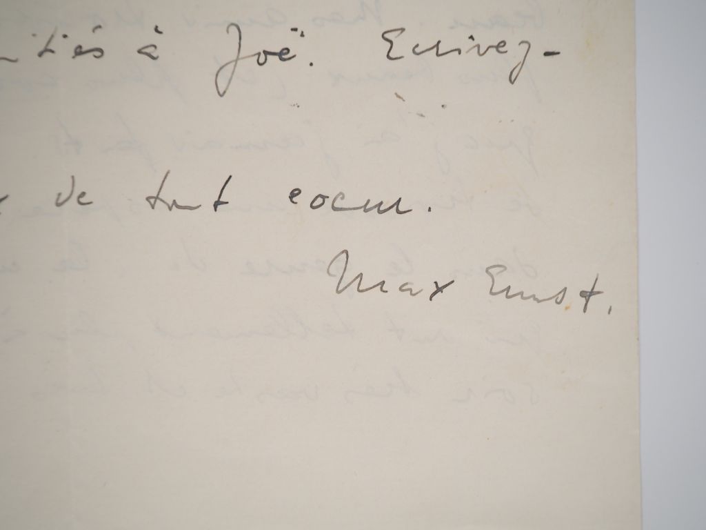 ERNST (M.). LETTRE AUTOGRAPHE signée adressée aux Ducellier. Deux pages sur un feuillet (269 X 209 mm) à en-tête manuscrit « 26, rue des Plantes. / PARIS. 14e / Dimanche [1935]. » MAGNIFIQUE LETTRE DANS LAQUELLE MAX ERNST DÉCRIT SON TABLEAU "LA VILLE ENTIÈRE". « Chers James et Jeanne, il me tarde d’avoir de vos nouvelles, mais j’imagine que vous allez bien tous les deux et j’espère que Joë est bien remis de sa maladie dont il parlait à [sic] une lettre à Marie-Berthe [Aurenche]. J’ai beaucoup pensé à vous en travaillant à un grand tableau "La ville entière" (146 X 97) qui est destiné (si vous n’avez pas changé d’avis) d’être accroché à la place où se trouve maintenant le tableau des fleurs. Je crois qu’il est très beau. Mes amis trouvent qu’il est un des plus beaux (et plus complets) tableaux que j’ai jamais faits. Au premier plan se trouve une espèce de jardin (ou forêt) dans le genre de "la nymphe Echo", les feuilles qui ont tellement plu à Joë). Un ciel de soir très vaste et très calme et clair. Je pourrais d’ici quelques jours vous en envoyer des photos. Il figurera aussi dans un livre 1) en entier, 2) des détails. Perdus dans le fouillis de la forêt et de la ville il y a quelques personnages. Je serais très heureux si ce ton bleu vous plaisait , dites-le-moi, et je vous l’enverrai au plus vite. Viendrez-vous à Paris prochainement ? Je m’ennuie un peu de vous deux. Zervos [Christian Zervos, directeur des Cahiers d’Art] est enfin de retour de l’Espagne et mon livre peut par conséquent sortir bientôt. Le retard a été bon à quelque chose : que "la ville entière" y trouve encore place. Mes grandes amitiés à Joë. Ecrivez-moi bientôt. À vous deux de tout cœur. Max Ernst. ».