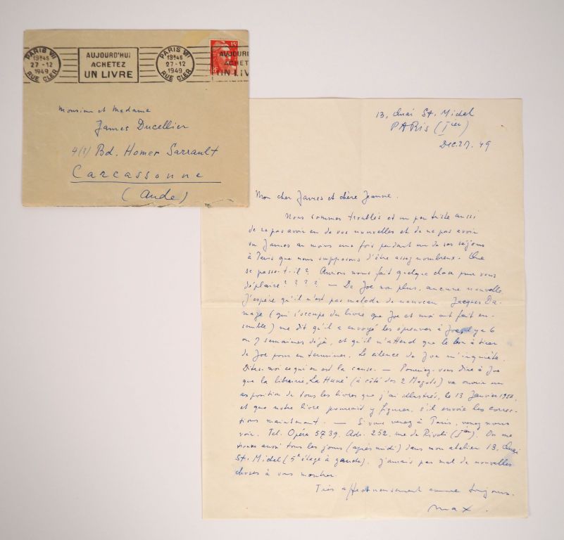 ERNST (M.). LETTRE AUTOGRAPHE signée adressée aux Ducellier. Une page sur un feuillet (269 X 207 mm) à en-tête manuscrit « 13, Quai Saint-Michel / PARIS (Iier) / Dec. 27. [19]49 » avec enveloppe timbrée. LETTRE DANS LAQUELLE MAX ERNST SE PLAINT DE NE PAS RECEVOIR DE NOUVELLES DE SES AMIS. Il ÉVOQUE SA COLLABORATION AVEC JOË BOUSQUET ["Partitions", ouvrage illustré de 23 dessins originaux de Max Ernst qui paraîtra en 1950 aux Éditions Jacques Damase et Full Score]. « Mon cher James et chère Jeanne, Nous sommes troublés et un peu triste aussi de ne pas avoir eu de vos nouvelles et de ne pas avoir vu James au moins une fois pendant un de ses séjours à Paris que nous supposons d’être assez nombreux. Que se passe-t-il ? Aurions-nous fait quelque chose pour vous déplaire ???? – De Joe [Bousquet] non plus, aucune nouvelle. J’espère qu’il n’est pas malade de nouveau. Jacques Damase (qui s’occupe du livre que Joe et moi ont [sic] fait ensemble) me dit qu’il a envoyé les épreuves à Joe, il y a 6 ou 7 semaines déjà, et qu’il n’attend que le bon à tirer de Joe pour en terminer. Le silence de Joe m’inquiète. Dites-moi ce qui en est la cause. – Pourriez-vous dire à Joe que la librairie "La Hune" (à côté des 2 Magots) va ouvrir une exposition de tous les livres que j’ai illustrés, le 13 janvier 1950, et que notre livre pourrait y figurer, s’il envoie les corrections maintenant. – Si vous venez à Paris, venez nous voir. Tel. Opera 5739. Adr. 252, rue de Rivoli (Iier). On me trouve aussi tous les jours (après midi) dans mon atelier 13, Quai St. Michel (5e étage à gauche). J’aurais pas mal de nouvelles choses à vous montrer. Très affectueusement comme toujours. Max. »