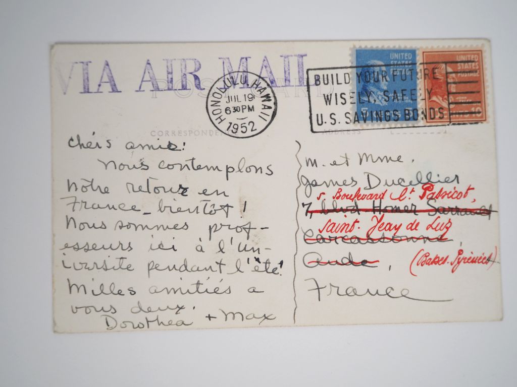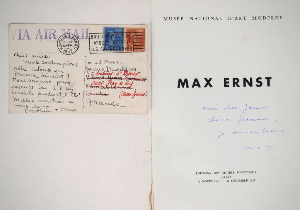 ERNST (M.). MAX ERNST. Paris, Éditions des Musées Nationaux, 1959. In-8 broché, 1er plat illustré. ÉDITION ORIGINALE de ce catalogue de l’exposition Max Ernst qui se tint au Musée National d’Art Moderne à Paris du 13 novembre au 31 décembre 1959. Il détaille 175 œuvres de l’artiste : peintures (94 numéros) – aquarelles, gouaches, dessins, collages, frottages, empreintes et photomontages (61 numéros) – Sculptures (20 numéros). Préface de Jean Cassou. ENVOI AUTOGRAPHE SIGNÉ de Max Ernst au couple Ducellier sur le feuillet de titre : « Mon cher James, chère Jeanne, je vous embrasse. Max ». JOINT une CARTE POSTALE AUTOGRAPHE adressée au couple Ducellier, rédigée par Dorothea TANNING, signée « Dorothea + Max », adressée d’Honolulu le 19 juillet 1952. La carte postale reproduit la photographie d’une « Hula girl », danseuse hawaïenne.