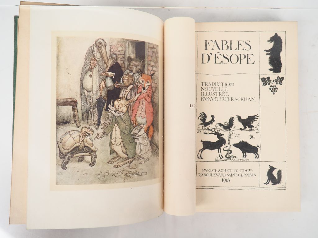 ÉSOPE. FABLES. P., Hachette, 1913. In-8 percaline verte illustrée de l’éditeur. TRADUCTION NOUVELLE ILLUSTRÉE par Arthur RACKHAM de 13 PLANCHES h.-t. couleurs sous serpente légendée et de dessins en noir dans le texte.