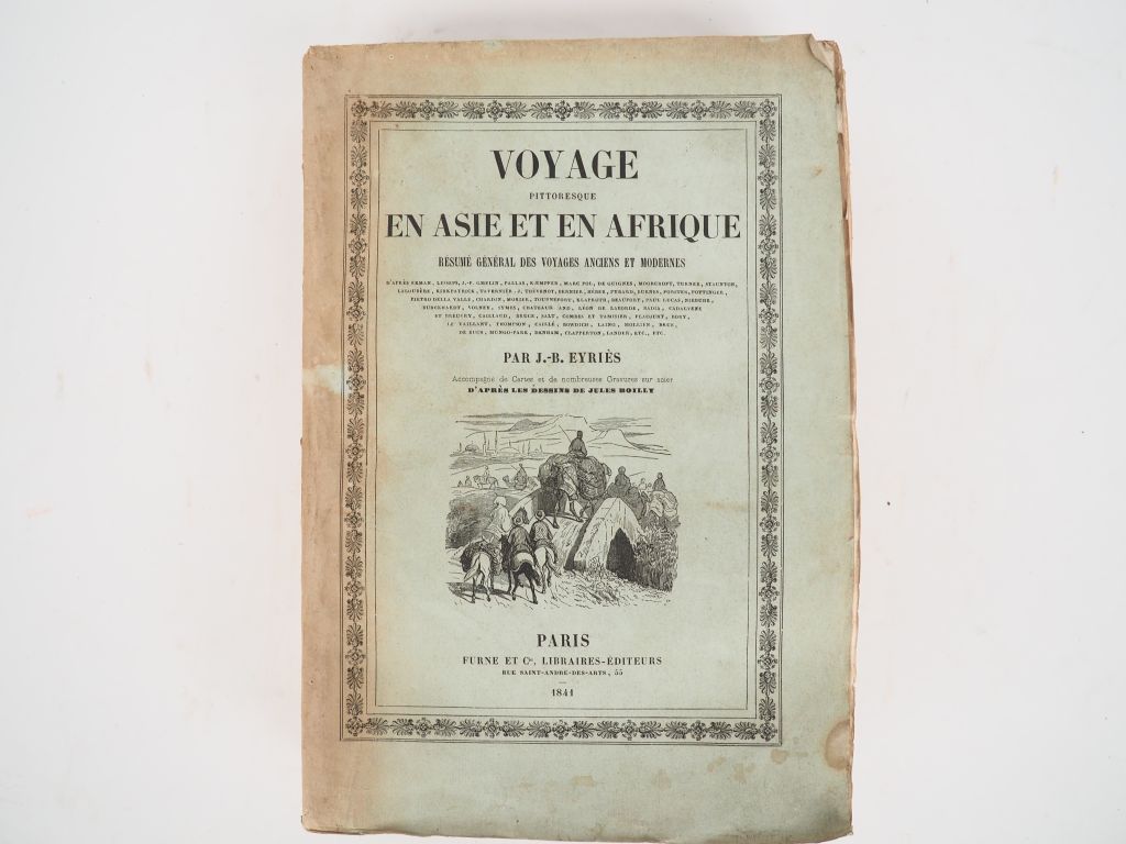 EYRIÈS (J.-B.). VOYAGE PITTORESQUE EN ASIE ET EN AFRIQUE. P., Furne et Cie, 1841. Grand in-8 broché. Couverture en partie décolorée, des planches uniformément brunies. ÉDITION ORIGINALE de cette importante compilation de voyages anciens et modernes. Nombreuses PLANCHES gravées sur acier h.-t. et une CARTE dépliante de l’Afrique. BON EXEMPLAIRE broché.
