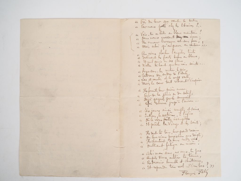 FABIÉ (François) (1846-1928). POÈME AUTOGRAPHE signé. Deux pages sur un f. double (13,5 X 21 cm). LONG POÈME DE 13 QUATRAINS intitulé Chez les rustiques, probablement extrait du recueil Voix rustiques publié chez Lemerre en 1892.
