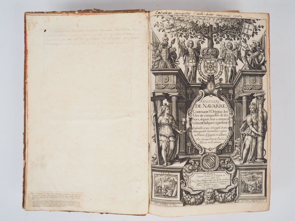 FAVYN (André). Histoire de Navarre contenant l'origine, les vies et conquestes de ses Roys depuis leur commencement jusques à présent. Paris, Laurent Sonrius, Pierre Mettayer, Pierre Chevallier 1612. in-folio. Titre front. -2 ff.-1340 pp + table. 1/2 veau, caissons et fleur. dor., pce de titre rouge (Rel. de l'époque). Titre-frontispice allégorique gravé par Léon Gaultier. Edition originale. Qqs piqures éparses.