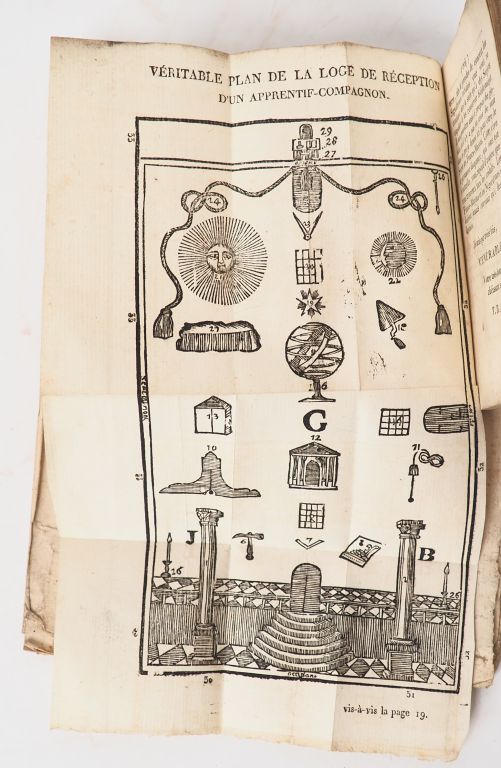 [FRANC-MAÇONNERIE]. [PÉRAU (Abbé)]. L’ORDRE DES FRANCS-MAÇONS TRAHI, et leur secret révélé. Amsterdam, Et se trouve dans toutes les Loges des vrais Amis Réunis, sans date. Petit in-12 broché, couverture papier muette (probablement postérieure) , 142 pp., 2 planches h.-t., (1) f. Côte de bibliothèque en tête du feuillet de titre sali, roussi et froissé, 1er plat de la couverture détaché. ÉDITION XVIIIe contenant 2 PLANCHES dépliantes gravées sur bois : Véritable plan de la loge de réception d’un apprentif-compagnon et Véritable plan de la loge de réception d’un maître – [DAUBERMESNIL (F.-A.)]. PREMIÈRE LETTRE SUR L’INSTITUTION NOMMÉE MAÇONNERIE. [Perpignan, 1801]. In-4 broché par un cordon , 20 pp. ÉDITION ORIGINALE. Dédicace manuscrite signée de l’auteur à un membre d’une loge de Narbonne in fine. ¶ Fesch, 1045 446. ENSEMBLE DE 2 OUVRAGES.