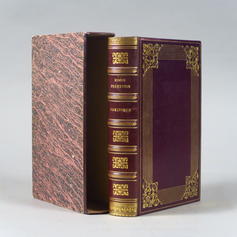 FROMENTIN (Eugène). Dominique. Avec 38 gravures sur bois de Jean PERRIER. Paris, Helleu et Sergent 1920. gd in-8. Maroquin ardoise à long grain, encadr. de 10 filets dorés raccordés aux angles par de larges rinceaux, fil. roulettes et larges fleur. dor. aux angles, frise d'encadr. dor. aux contreplats, coupes filetées, tr. dor. couv. et dos, étui broché (Randeynes et Fils) Gravures sur bois dans le texte et hors-texte. Tirage limité à 750 ex. 1/75 sur vergé d'Arches, avec une suite sur Chine de toutes les illustrations. Très bel exemplaire
