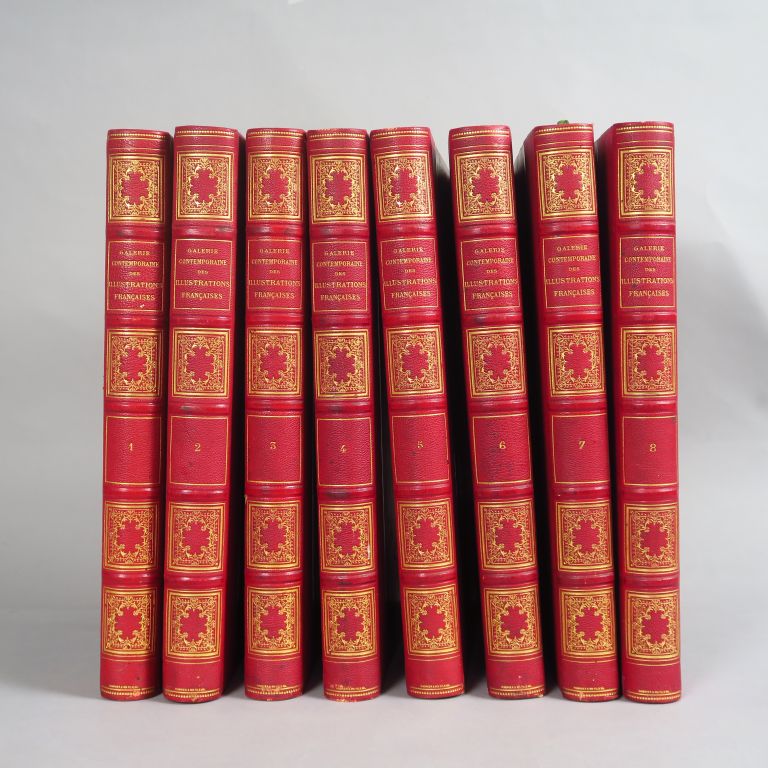 GALERIE CONTEMPORAINE des Illustrations françaises. Paris, Paul de Lacroix s.d. (ca 1890). 8 vol. in-folio. 1/2 chagr. rouge à coins, caissons ornés (Magnier et Fils rel.) 130 planches de portraits photographiques des personnalités du monde littéraire artistique, scientifique et politique par Nadar, Carjat, Adam Salomon, Mélandri, Sand, Dumas Père et fils, Bracquemond, Zola, Alphonse Daudet, Gounod, Rossini, Pasteur, Eiffel dont 65 de grand format, tirés en photoglyptie et contre-collés sur carton fort. Bien complet du célèbre portrait de Baudelaire par Carjat. Le recueil contient en outre 133 planches de reproductions de tableaux et de sculptures selon le même procédé (procédé Woodbury)