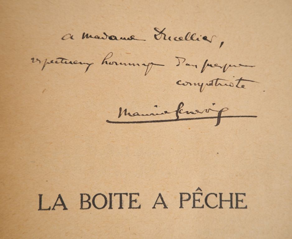 GENEVOIX (Maurice). 4 OUVRAGES (3 avec E.A.S., 1 signé). - JEANNE ROBELIN. Roman. P., Flammarion, 1920. In-12 broché. Dos bruni. E.A.S. : « à Madame Ducellier, respectueux hommage. Maurice Genevoix ». - RÉMI DES RAUCHES. Roman. P., Flammarion, 1922. In-12 broché. Dos bruni avec petits manques. Signature autographe de l’auteur sur le faux-titre. - RÉMI DES RAUCHES. Roman. P., Marcel Seheur, 1926. In-4 broché. Édition illustrée de bois gravés de Deslignières. UN des 400 exemplaires numérotés sur vélin d’Arches. E.A.S. : « Pour Monsieur James Ducellier, cordial hommage. Maurice Genevoix ». - LA BOÎTE À PÊCHE. P., Grasset, 1926. In-12 broché. Mention fictive de « 9e édition » au 1er plat de la couverture. Dos légèrement bruni. E.A.S. : « à Madame Ducellier, respectueux hommage d’un presque compatriote. Maurice Genevoix ».