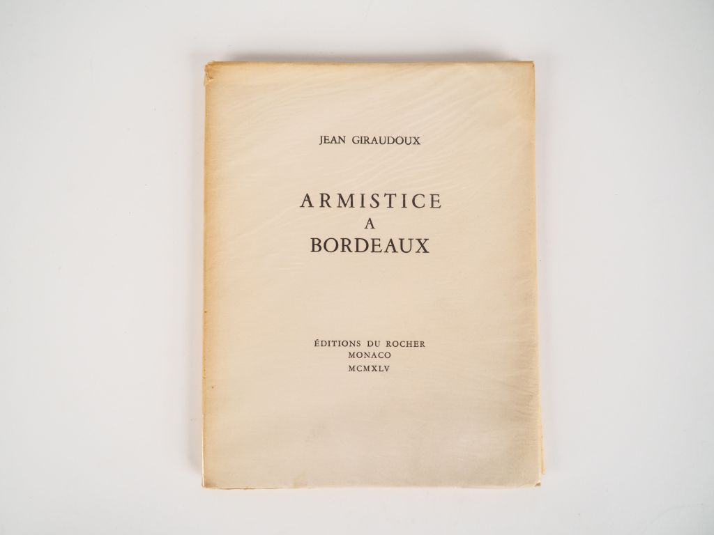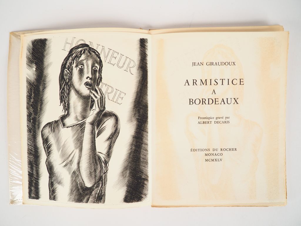 GIRAUDOUX (Jean). Armistice à Bordeaux. Monaco, Editions du Rocher 1945. Plaquette in-4, 58 pp. en ff. Frontispice gravé par DECARIS. Edition originale. 1/500 num. sur chiffon d'annenay