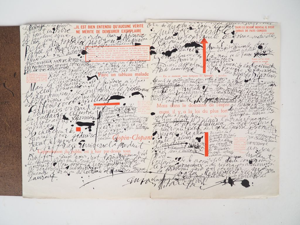 HANTAÏ (Simon). Sexe-Prime. Hommage à Jean-Pierre Brisset et autres peintures. Paris, Galerie Kléber mai-juin 1956. 2 cahiers 24 x 32 cm (8pp) + 2pp : texte d'Hantaï. Sous chemise cartonnée. Joint : - HANTAÏ. Peintures récentes. Souvenir de l'Avenir. Paris, Galerie Kléber, mars 1958. 1 fol. 62 x 98 cm (16 pp), imprimé recto-verso. Texte manifeste "Notes confusionnelles accélérantes et autres pour une avant-garde réactionnaire non réductible "imprimé en rouge. Reproduction en noir au verso des Notes préparatoires pour les cérémonies commémoratives de la condamnation de Siger de Brabant… ". Chemise cartonnée