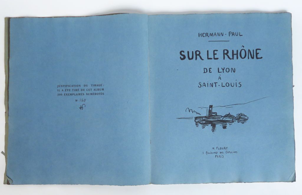 HERMANN-PAUL. Sur le Rhône de Lyon à Saint-Louis. Paris, Floury s.d. (1913). in-plano (40 x 48 cm), broché, sous couv. Rempliée. Suite de 51 dessins imprimés, sur vélin blanc et montés sur papier chiffon bleuté, 2 vignettes en couverture. Tirage : 300 ex. num. Fente au premier plat de couverture