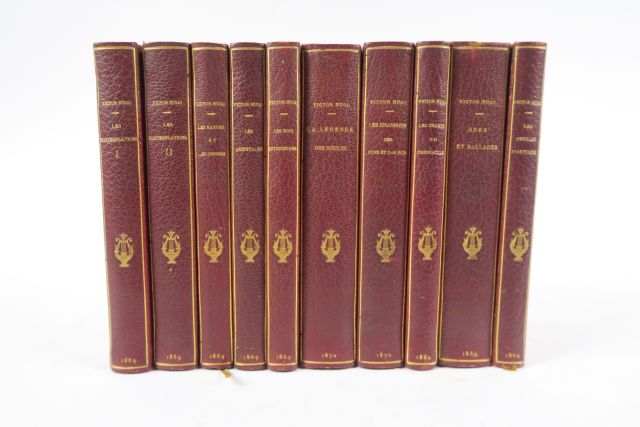 HUGO (Victor). Œuvre poétique. Edition elzévirienne. Paris, Hetzel 1869-1870. 10 vol. in-18 raisin. Bradel 1/2 maroquin bordeaux à coins, dos lisse, encadr. et lyre dor. au centre, fil. dor. sur les plats, tête dor., couv. et dos (Rel. d'époque). Agréable édition, imprimée par Jouaust sur vergé de Hollande. Frontispices.