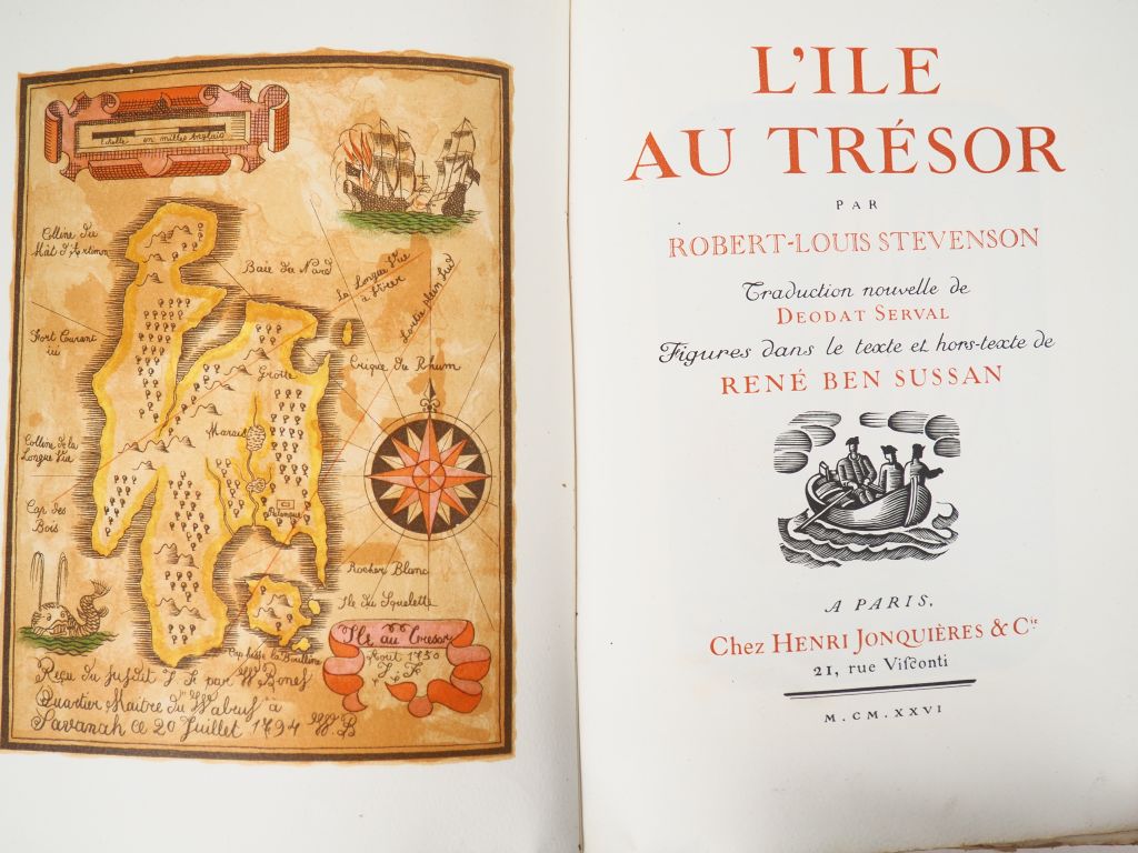 [ILLUSTRÉS]. LABORDE (G.). ÉCOLE DE PATIENCE. Monaco, À la Voile latine, 1951. Grand in-4 broché, chemise et étui. ÉDITION ILLUSTRÉE de COMPOSITIONS en noir et couleurs de Chas Laborde – STEVENSON. L’ÎLE AU TRÉSOR. P., Jonquières, 1926. In-4 broché. ÉDITION ILLUSTRÉE de figures dans le texte et hors-texte de René BEN SUSSAN. ENSEMBLE DE 2 OUVRAGES.