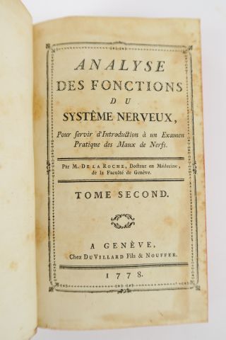 LAROCHE (M. de). Analyse des fonctions du système nerveux. Genève, Duvillard et Nouffer 1778. 2 vol. in-8. Veau granité, dos lisses ornés (Rel. d'époque). Mors fendu et faible et manque à la coiffe du tome II.