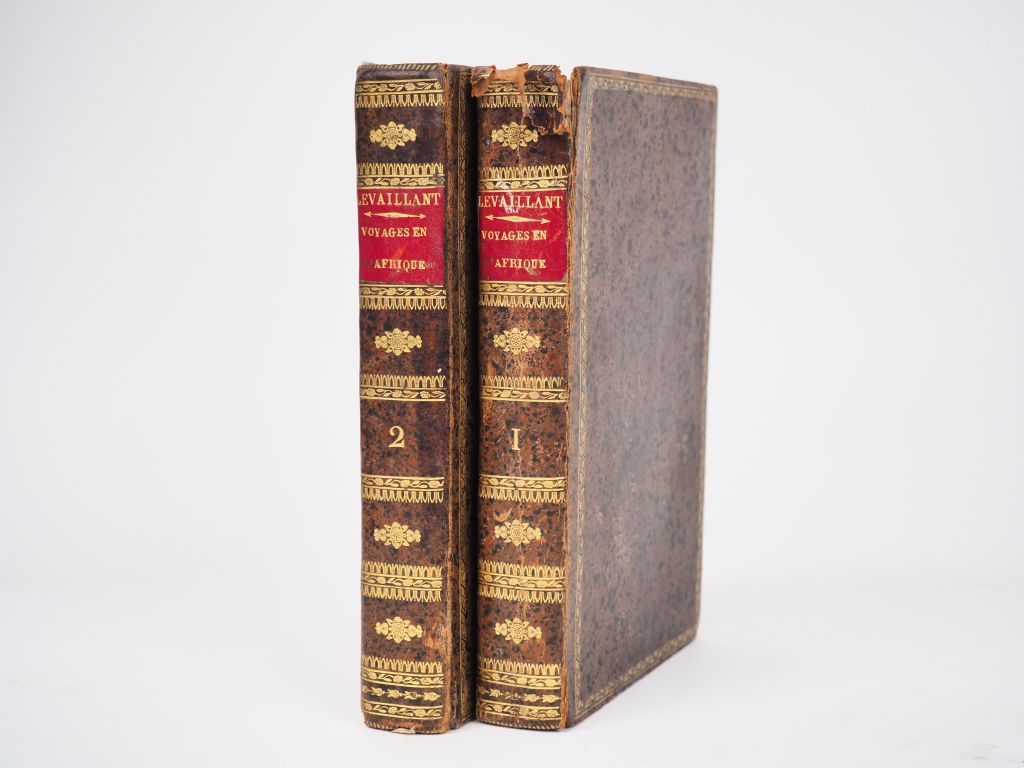 LE VAILLANT (F.). VOYAGE DE F. LE VAILLANT, dans l’intérieur de l’Afrique, par le Cap de Bonne-Espérance. P., Desray, An VI [1798]. Deux volumes in-8 basane brune granitée, encadrement de roulette dorée sur les plats, dos lisse cloisonné et orné, pièce de titre maroquin rouge (Reliure de l’époque). Accroc à la coiffe supérieure du tome I avec pertes de cuir. Ex-libris. SECONDE ÉDITION, revue, corrigée et considérablement augmentée par l’auteur. 20 PLANCHES gravées en taille-douce, dont 8 inédites. ¶ Chadenat, 1660, pour la 1ère édition de 1790 - Gay, 3118, pour la 1ère édition.