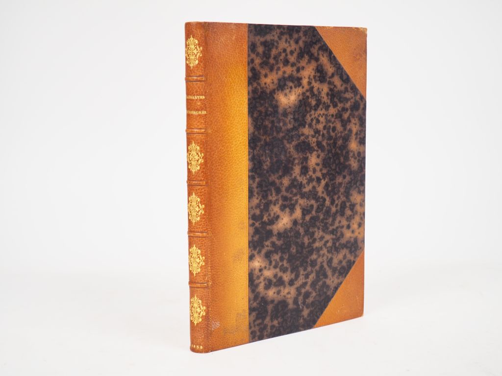 [LEBER (C.)]. PLAISANTES RECHERCHES D'UN HOMME GRAVE SUR UN FARCEUR. Prologue tabarinique, pour servir à l’histoire littéraire et bouffonne de Tabarin. P., Crapelet, 1835. In-8 ½ maroquin havane clair, dos à nerfs orné, titre doré, tête dorée (V. Niédrée). Rousseurs éparses. ÉDITION ORIGINALE. Tirage de luxe limité à 51 exemplaires. UN des 15 numérotés sur grand colombier vélin.