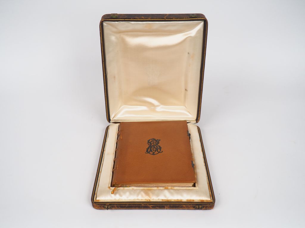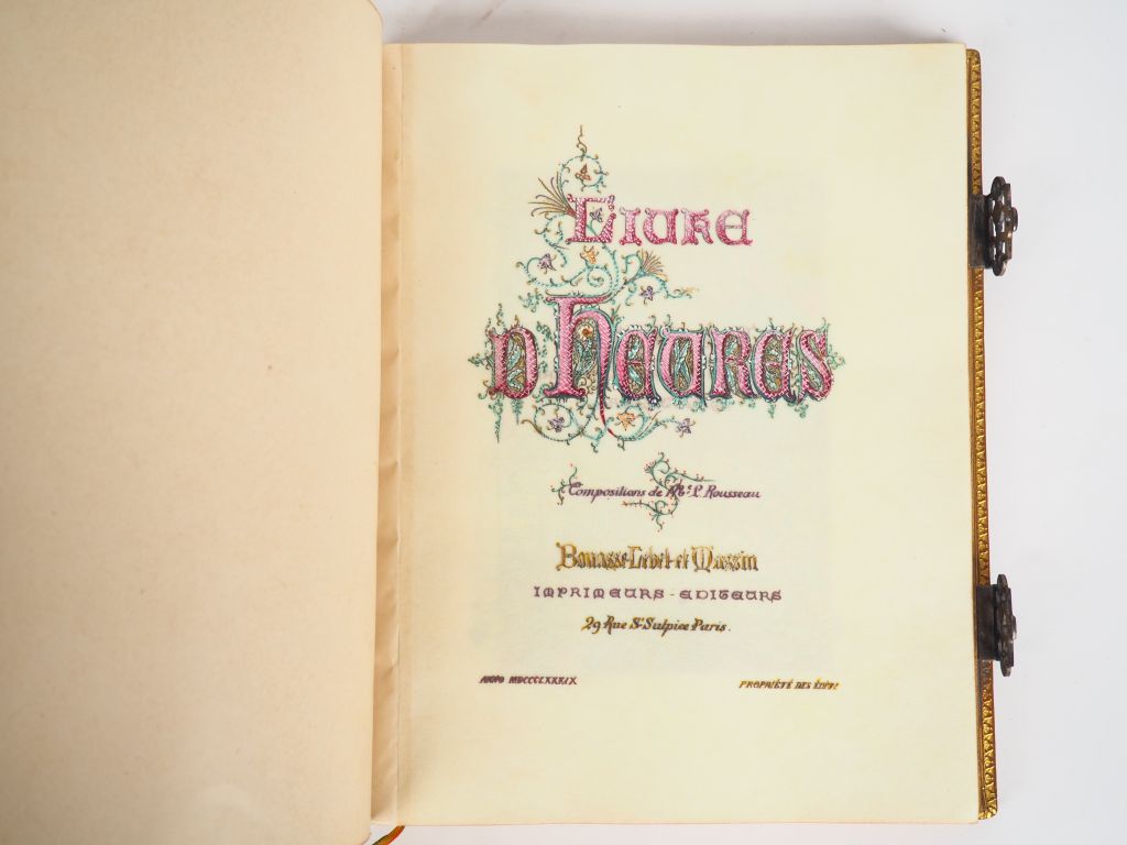 LIVRES D’HEURES. P., Bonasse, Lebel et Massin, 1889. In-8 carré maroquin miel, 1er plat orné d’un monogramme ciselé en métal, dos à nerfs, titre à froid, bordure intérieure ornée d’une large dentelle dorée, fermoirs de laiton ouvragés, tranches dorées et ciselées d’un motif floral, grande boîte-écrin de chagrin brun décorée de roulette et filets dorés, doublée de soie écrue (Reliure de l’époque). Épidermures à la boite, infimes frottements au mors supérieur de la reliure. ÉDITION IMPRIMÉE SUR PEAU DE VÉLIN, entièrement ENLUMINÉ à l’aquarelle, or et argent à la manière des manuscrits médiévaux. Beau FRONTISPICE en couleurs. MAGNIFIQUE EXEMPLAIRE luxueusement relié en maroquin, en BEL ÉTAT.