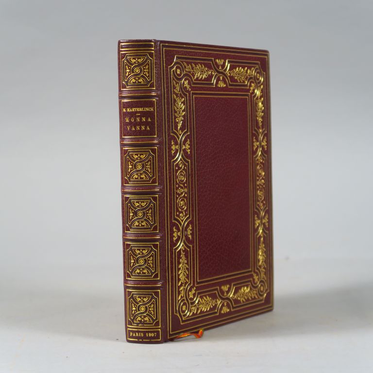 MAETERLINCK (Maurice). Monna Vanna. Pièce en 3 actes illustrée par P. -Albert LAURENS. Paris, Impr. Pour la Société du Livre d'Art pour l'Imprimerie Nationale 1907. in-4. Maroquin brun, caissons de fil. droits et courbes entrelacées au dos, large cadre de fil. droits. et courbes garnis de feuillage dorés au dos, doublure de maroquin havane clair, orné d'un cadre de fil. et pointillés dor. garni d'une guirlande de rinceaux dorés. doublure de tabis bordeaux, coupes filetées, tr. dor. couv. et dos, étui bordé (Lortic). Compositions dans le texte et hors-texte, lettrines et ornements de P.-A Laurens gravées en couleurs. Tirage limité à 130 ex. Celui-ci nominatif. Qqs rousseurs