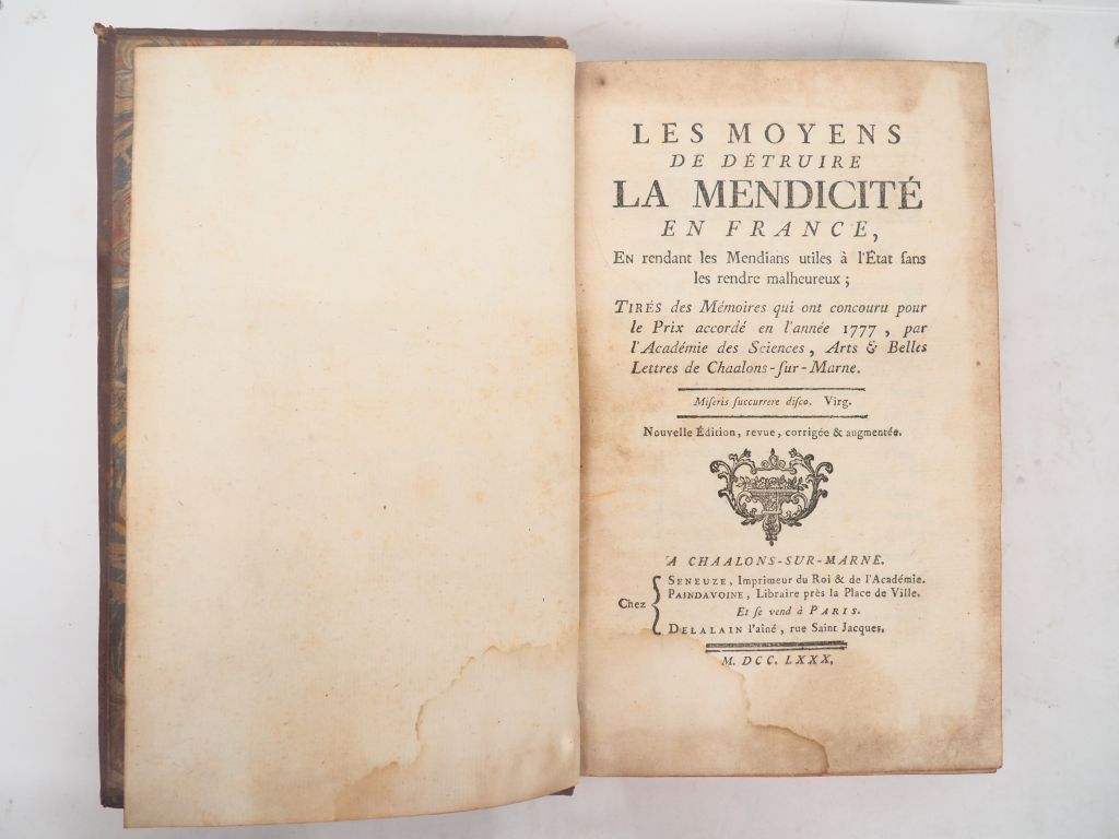 MALVAUX. LES MOYENS DE DÉTRUIRE LA MENDICITÉ EN FRANCE, en rendant les Mendians utiles à l’État sans les rendre malheureux. Châlons-sur-Marne, Seneuze, Paindavoine, Delalain, 1780. In-8 veau fauve marbré, plats ornés d’un encadrement de triple filet doré, dos à nerfs orné, pièce de titre maroquin rouge, tranches rouges (Reliure de l’époque). Tache sombre en queue de la reliure. NOUVELLE ÉDITION revue, corrigée et augmentée.