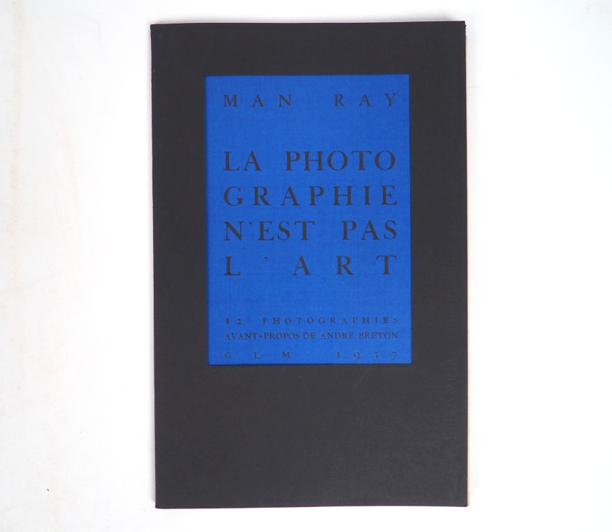 MAN RAY. LA PHOTOGRAPHIE N’EST PAS L’ART. Avant-propos de André Breton. P., G.L.M., 1937. In-8 sous chemise noire au 1er plat ajouré et rabat, couverture bleue. ÉDITION ORIGINALE ILLUSTRÉE de 12 PHOTOGRAPHIES en noir et blanc de MAN RAY reproduites en simili sur papier couché jaune paille. Exemplaire en PARFAIT ÉTAT.