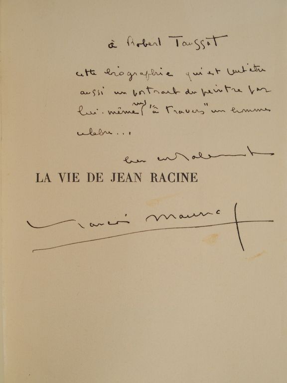 MAURIAC (François). La Vie de Jean Racine. Paris, Grasset 1930. in-8. 1/2 chagr. rouge, couv. et dos cons. Edition originale num. sur vélin pur chiffon. Bel envoi a. s. : « Cette biographie qui est peut-être aussi un portrait du peintre par lui-même, vu « à travers » d'un homme célèbre...».
