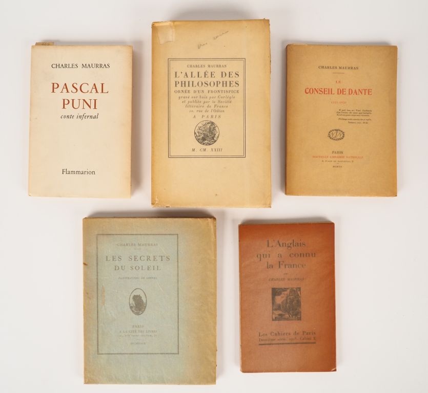 MAURRAS (Charles). Les Secrets du Soleil. Illustrations de Gernez. Paris, la Cité des Livres 1929. in-8, br. Ed. originale. 1/60 sur Hollande. - L'Allée des Philosophes.Frontispice sur bois de Carlègle. Paris, Société littéraire de France 1923. in-8, br. - Le Conseil de Dante. 1321-1921. Paris, Nouvelle Librairie Nationale 1920. - Pascal puni. Conte infernal présenté par Henri Massis. Paris, Flammarion 1953. - Maurice Barrès. Bois gravés de Roland Brudieux. Paris, A la Girouette 1948. -L'Anglais qui a connu la France. Paris, Les Cahiers de Paris, 1928. in-12, br. Ensemble de 5 volumes