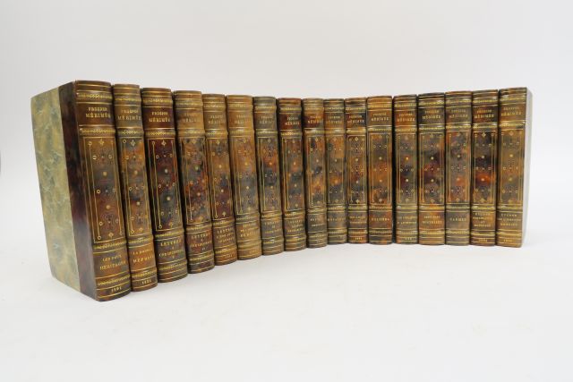 MÉRIMÉE (Prosper). Œuvres. – Carmen. – Chronique du Règne de Charles IX. – Columba. – Les cosaques d'autrefois. – Dernières Nouvelles. – Les Deux Héritages. – La Double Méprise. – Episode de l'Histoire de Russie. – Etudes sur les Arts au Moyen-Age. – Etude sur l'histoire romaine. – Lettres à une inconnue (2 vol.). – Lettres à une autre inconnue. – Mélanges historiques et littéraires. – Mosaïque. – Portraits historiques et littéraires. – Théâtre de Clara Gazul. Paris, Calmann Levy de 1883 à 1892 et s.d. 17 vol. in-18 en reliure uniforme 1/2 veau marbré, décor à froid et dor. Bel ensemble joliment relié.