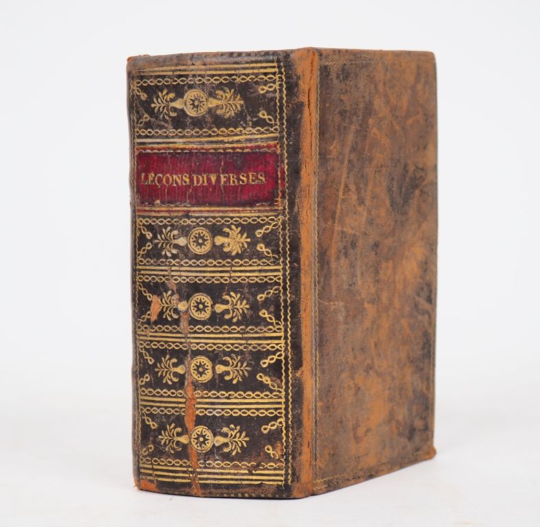 MESSIE (P.). LES DIVERSES LEÇONS DE PIERRE MESSIE Gentilhomme de Sevile [Séville]. Contenant variables et memorables Histoires, mises en François par Claude Gruget Parisien. P., Nicolas Bonsons, 1584. Fort volume in-16 basane brune, double encadrement de filet doré sur les plats, dos lisse cloisonné et orné, pièce de titre maroquin grenat, tranches rouges (Reliure ancienne) , (12) ff. dont titre, 616 ff.Marge de tête courte mais sans atteinte au texte NOUVELLE ÉDITION, revue, corrigée et augmentée de ce CURIEUX RECUEIL à vocation encyclopédiste, traitant à la fois de médecine, de gastronomie, mais aussi de l’origine de Mahomet, de l’empire des turcs, de diverses cérémonies en mariage, de guérisons merveilleuses, etc. Exemplaire en BEL ÉTAT, dans une reliure datant probablement du XVIIe. ¶ Caillet, III-91 – Dorbon, 3061, pour l’édition de 1554 (longue notice).