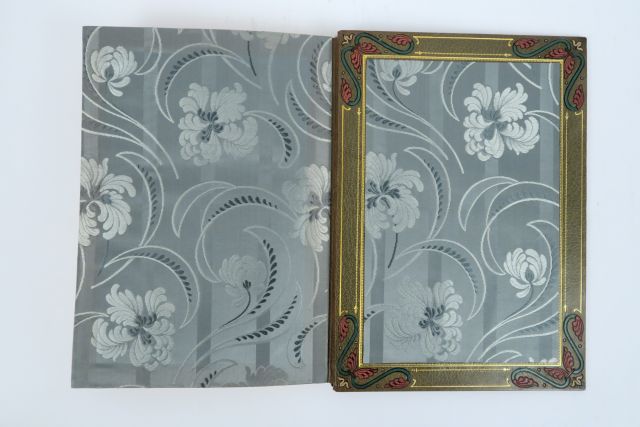 MIKHAËL (Ephraïm). Halyartès. Poème en prose. Imprimé pour la Société du Livre d'Art 1904. in-4. Maroquin vert bronze, fil. dor. et large encadr. Art nouveau mosaïqué, caissons dor. et mosaïqués au dos, cadre int. mosaïqué à l'identique, doublure de soie gris perle brodée de larges motifs floraux, tr. dor., étui bordé (Granghaud). Illustrations de Paul Gervais, gravées à l'eau-forte en couleurs par Xavier Maccard. Tirage limité à 100 ex. sur Arches de la Maison Périgot-Masure. 1/75 ex. nominatifs réservés aux membres de la Société, avec une double suite en noir des illustrations. Très bel exemplaire somptueusement relié. Le dos a viré.
