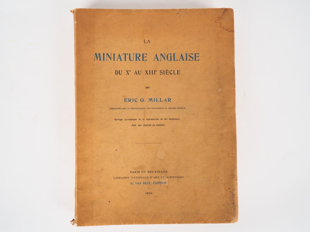MILLAR (Eric G.). La Miniature anglaise du X° au XVIII°siècle. Paris et Bruxelles, Van Oest 1928. in-folio, br. Frontispice en couleurs et 100 planches contenant la reproduction en noir de 164 miniatures. Rousseurs, coutures laches.