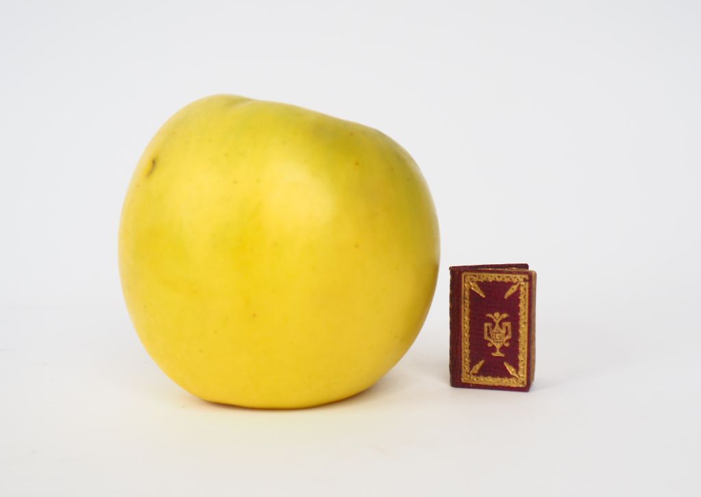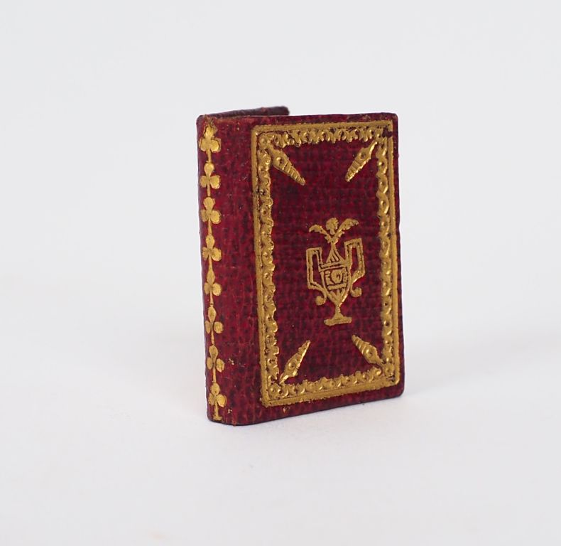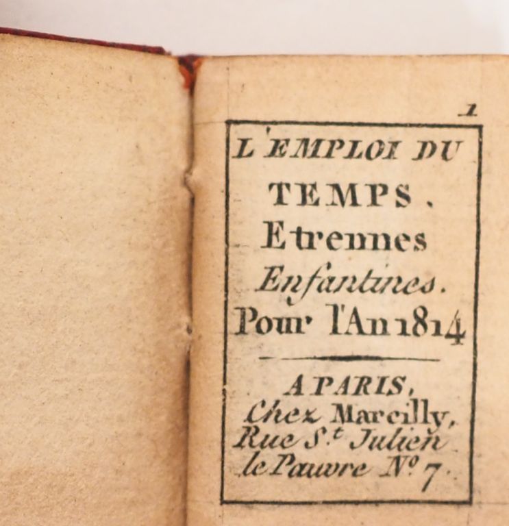 [MINUSCULE]. L’EMPLOI DU TEMPS. Étrennes Enfantines pour l’An 1814. Paris, Marcilly, [1814]. Minuscule (28 X 20 mm) maroquin rouge décoré, tranches dorées (reliure de l’époque) , 64 pages. ÉDITION MINUSCULE en maroquin décoré de l’époque. Recueil de chansons orné de 8 GRAVURES sur bois à pleine page représentant des sujets enfantins. Calendrier. ¶ Grand-Carteret, 435.